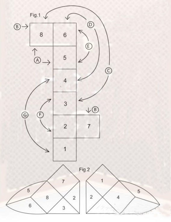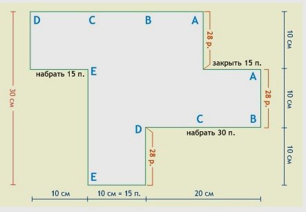 Схема показывает ориентировку направления вязания квадратов. Сшитую заготовку собираем, соединяя одноименные стороны следков: А-А, В-В и т. д.