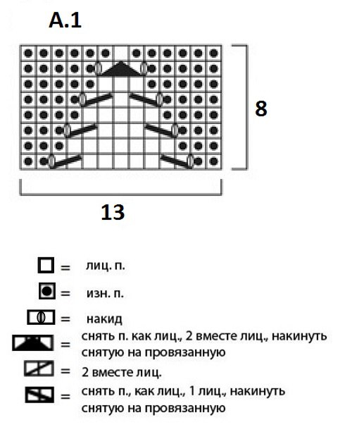 Набираем спицами 49; 53; 57п. и вяжем 8р. платочным рис-ом. Затем продолжаем: 1п.- платочн. рис –к, 17; 19; 21п. – лицев. гл., 13п. – схема А.1, 17,19; 21п. – лицев. гл., 1п. – платочный рис-ок. Продолжаем по узору, прибавляя в первом и в каждом последующем рядках по 1п. по бокам от центральных 13п. (см. пояснение выше). Сделав прибавления 15; 17; 20 раз, получаем 79; 87; 97п. Провязываем еще 1 ряд после прибавок.