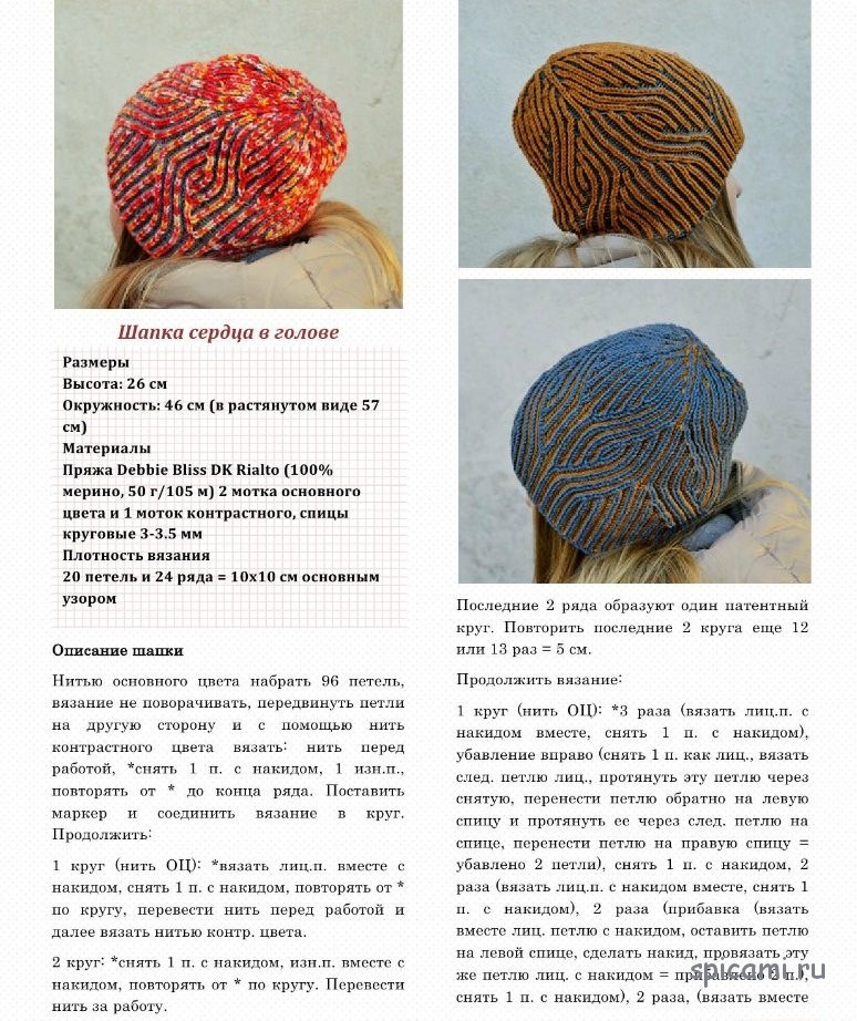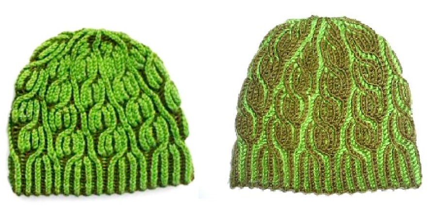 На спицах 18 птл. Провязываем два р. патентной резинкой, отрезаем нити, продеваем через петельки, стягиваем, закрепляем. Аккуратно прячем хвостики, учитывая, что узор у нас двусторонний и шапка может носиться на любую сторону рисунка.