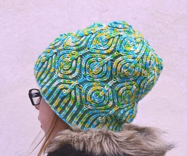 Следующая интересная модель шапочки в технике бриошь называется «Морозные узоры». Уроки по ее выполнению представлены в видео «Вяжем с Марией». Вязание шапки бриошь рассматривается в нескольких мастер классах.