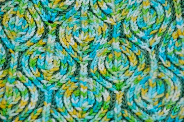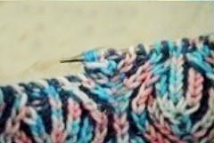 Начинаем с набора круг. спицами ГЦ пряжи 98 птл методом витого набора. Для большей эластичности начального р. можно взять спицы большего диаметра, чем основные. Вязание не переворачиваем (это у нас будет лиц. сторона шапочки), а сдвигаем птл на другой конец спиц. Подсоединяем ДЦ пряжи.
