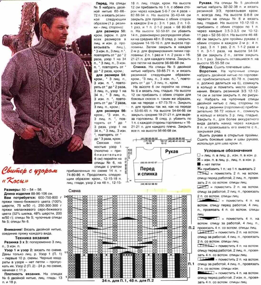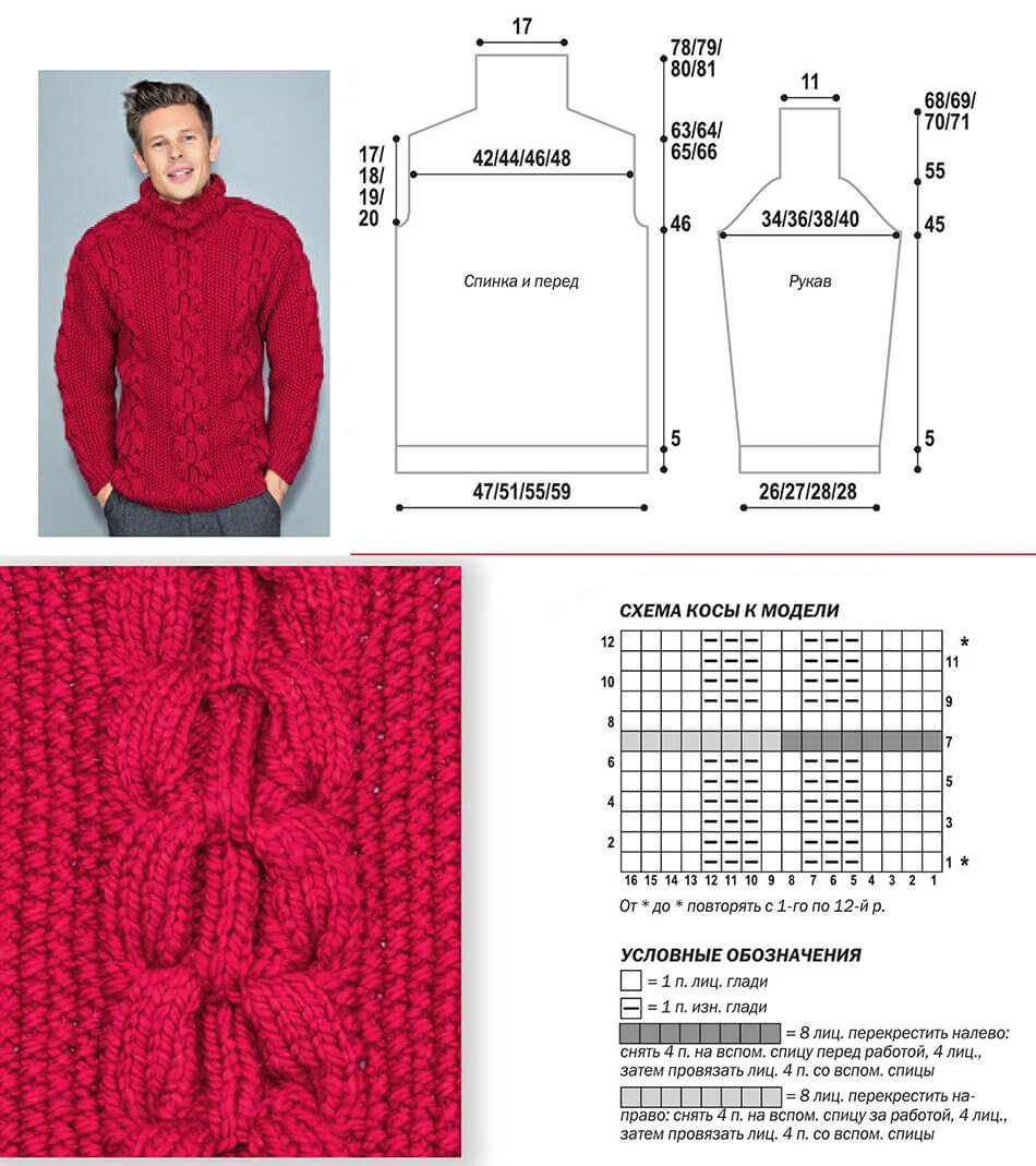 Для данного узора особенно важно обеспечить заданную плотность. Рекомендуем связать 14 см образца на 32 петлях. Затем рассчитать плотность на среднем участке полотна. При несоответствии заданной, заменить спицы на более толстые или тонкие. Изделие вывязывать на таких же спицах.