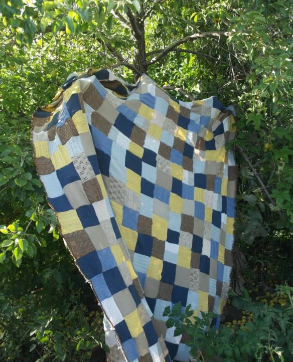 Следующий этап – сшиваем плед полностью. Если мы все выполнили аккуратно, то и изнаночная сторона пледа из старых свитеров смотрится красиво и не требует дополнительной обработки.