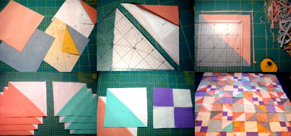 Из нескольких квадратов сделаем печворк детали. Для этого большие квадраты со стороной 21см складываем по 2 шт. лицевыми сторонами внутрь, рисуем диагональную линию. Фиксируем элементы булавками. С двух сторон от диагональной линии прострачиваем блок из квадратов. Разрезаем по линии и разворачиваем. Припуск шва заглаживаем на сторону более темной ткани.