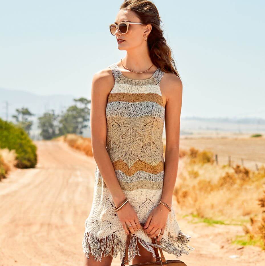 Экстравагантное мини-платье с бахромой внесёт нотку экзотики в ваши будни. Модель связана смешанной пряжей с переменной структурой.