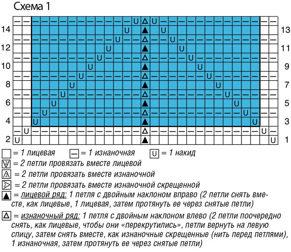 - ажурный фрагмент А (2): выполняется на 25 (29) петлях по схеме №1. На схеме показаны все рядки. Для 34-36 размеров выполняем только показанные синим цветом петли с 3-го по 14-ый р. Для 40-42 размеров выполняем все петельки и ряды схемы. Выполняем один раз с 3-го по 14-ый р.(с 1-го по 14-ый р).