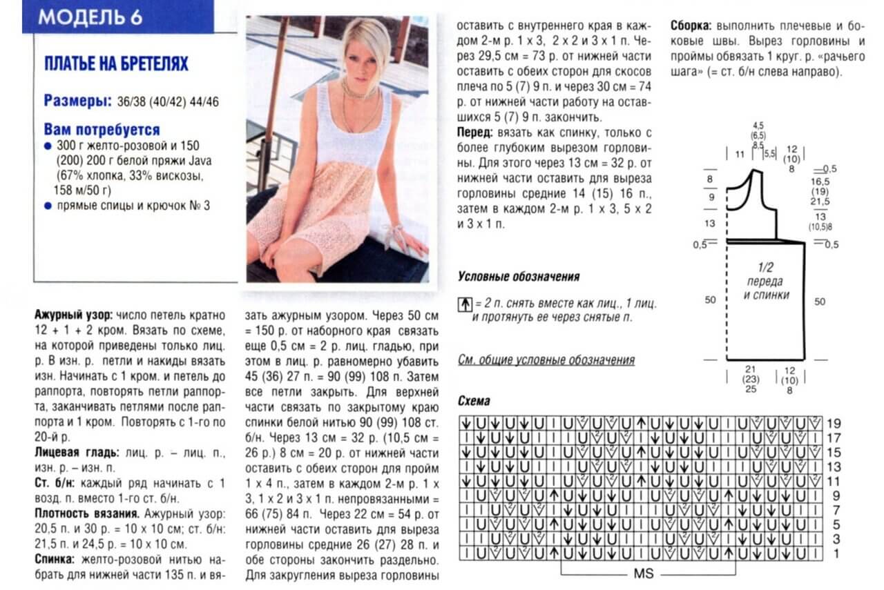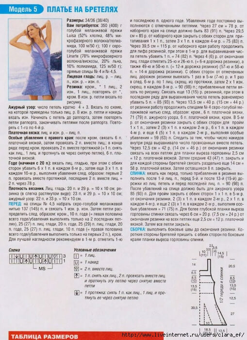 Выполняем швы на боках. На передней детали с двух сторон серой меланжевой пряжей набираем спицами № 3,5 по скосу проймы на отрезке 5 см, начиная от верхнего угла по 15 п. и выполняем узор 6. Получив длину бретелек 15 (16) см (проверяем при примерке, корректируем до получения комфортной длины), закрываем все петли по видимому рисунку.