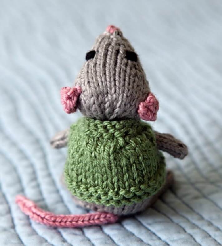 Рост мышонка при вязании акриловой нитью «Суфле», сложенной вдвое, и с использованием спиц №2 составляет 7 сантиметров.