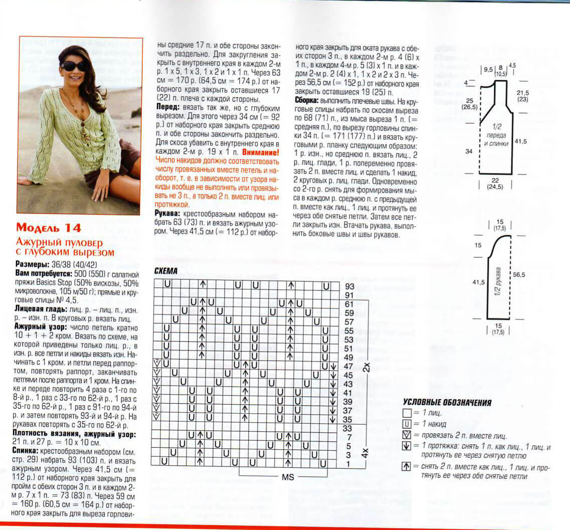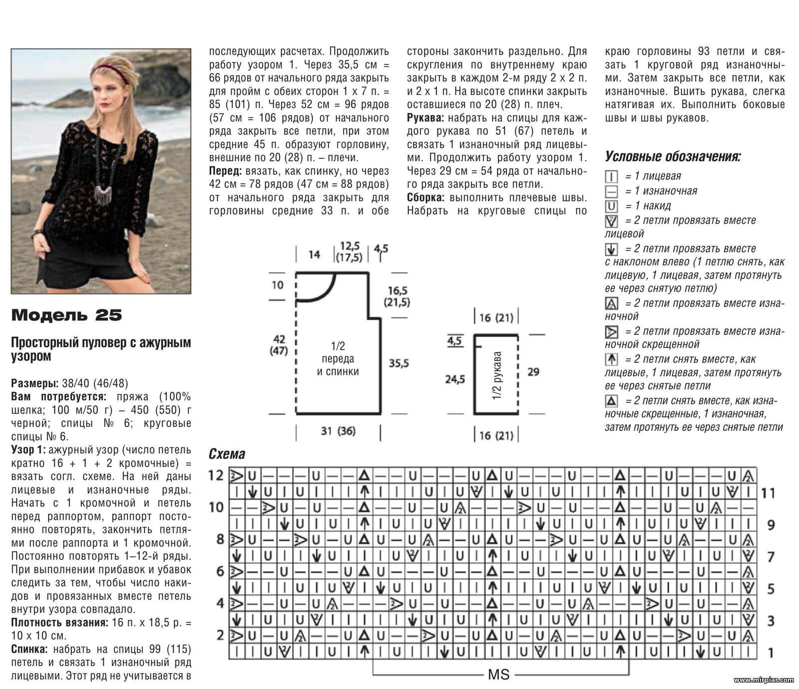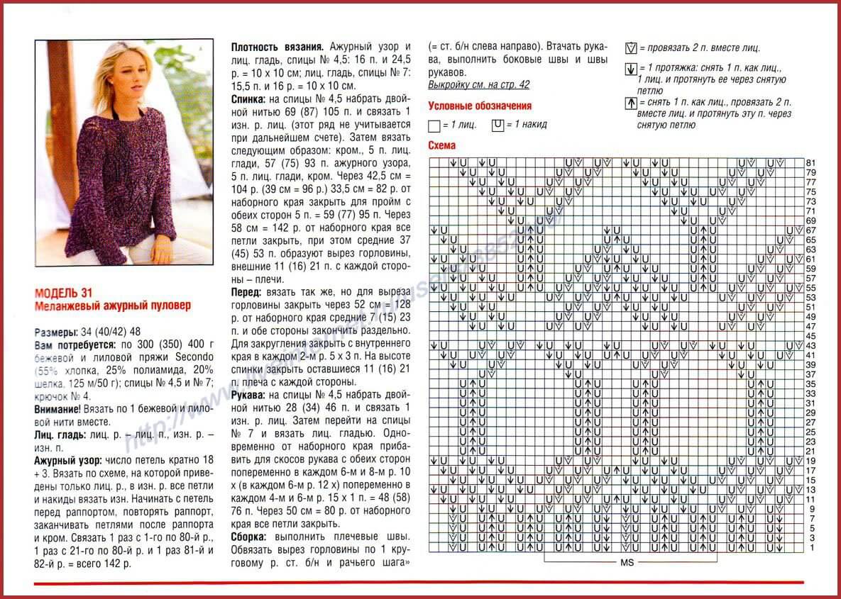 - плотность вязки спицами №4,5 в две нити: на лиц. или изн. гл. 17,5 п. на 29 р. – 10 на 10 м; на косе 18 п. – 8 см; на ажуре – 25,5 см на 26,5 р. – 10 на 10 см.