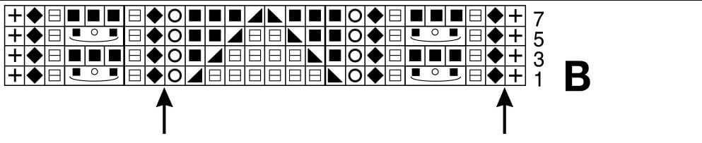 - ажур: схема В; ряд начинаем с птл перед раппортом, потом вяжем повторения раппорта, авершаем ряд петлями после него. Горизонтальный раппорт равен 17 птл, вертикальный 8 р.