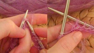 3.Этот ЛЦ Р начнем четырьмя п., провязанными одновременно с наклоном влево. Чтобы сделать данный элемент, подхватываем 3 П по одной, за переднюю стенку, и перекидываем на правую спицу. Получается, что они переворачиваются. Четвертую же вяжем лицевой, а потом накидываем на нее по очереди 3и перевернутые п.
