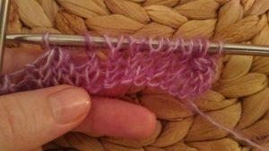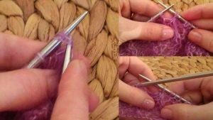 1. Начинаем создание шарфа из мохера с 13 лицевых петель (ЛП), дальше нужно связать 4 изнаночные (ИП), после, две П одновременно лицевой, с наклоном вправо (2 лв п). То есть, 2 П провяжем за переднюю стенку. Петельки слегка наклоняются в правую сторону.