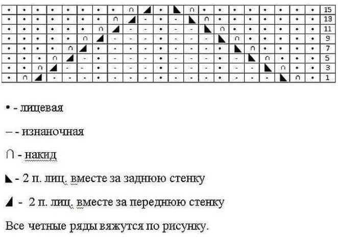 - 13 р.: *снимаем накид, 13 л. п., 1 н., снимаем 1 п. без провязывания, 2 л. п. в 1 л. п., продеваем снятую петлю через провязанную* – ** связать так до конца р.;