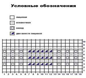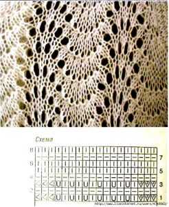 Схема продолжается в 6 ряду. Он весь вяжется изнаночными петельками. Причем, для лучшего формирования рисунка, накиды лучше подцеплять и провязывать за передние стенки. Таким образом, полотно получится более однородным и ровным.