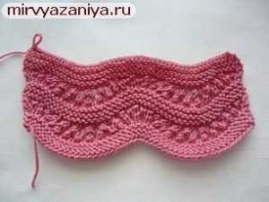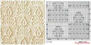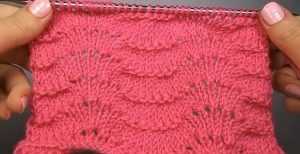 Павлиний хвост по второму рисунку не такой ажурный, как предыдущий. Он более схож с волной и так же выполняется спицами. Схема вязания достаточно проста. Вот такой образец у вас должен получиться.