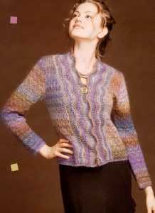 Павлиний хвост очень хорош, если использовать его в отдельных деталях. Например, как на фото ниже, им отделаны края полочек кофты. Они становятся волнистыми, чем придают вещи оригинальность и делают ее более интересной.