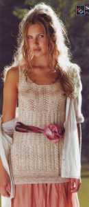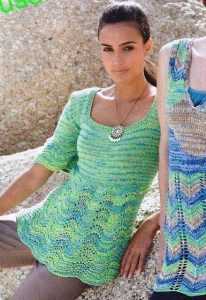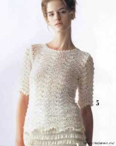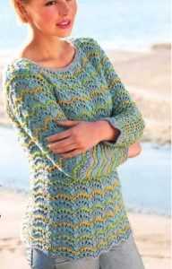 - Используйте рисунок в сочетании с другими схемами вязания. Однако, чтобы два ажурных узора не затеняли друг друга, их не вяжут вместе. Вот кофточка – для верхней части применили лицевую глядь, для нижней и рукавов – перо.