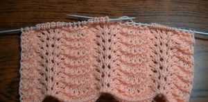 Первый вариант выполнения спицами этого узора позволяет получить нежное, красивое, невесомое полотно. Его можно использовать для создания всевозможных шалей и палантинов. В готовом виде вы получите вот такое контрольный образец.