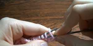 - Теперь делаем сдвоенные изнаночные три раза. Остается связать кромочную, если это конец ряда или вновь перейти к началу раппорта.