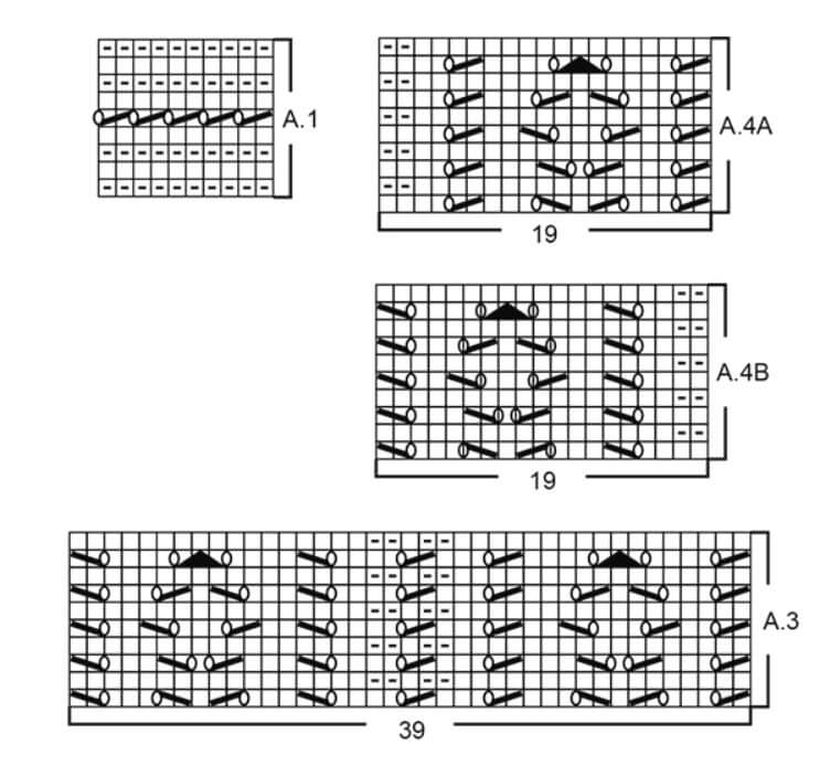 Спицами No4 набираем 109; 117; 123; 133; 143; 153 птл, вяжем узор по сх. А1. Обратите внимание, что 1-ый вывязываемый ряд будет ИР, в пятом р. этой сх. 2 птл в 1 л/п вывязываются также с ИР, крайняя птл р. вывязывается л/п.