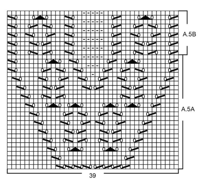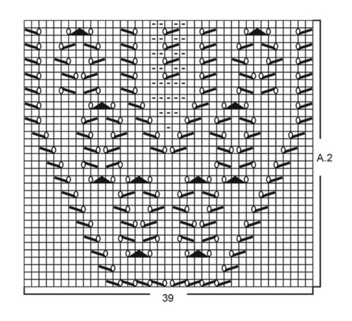 Закончив вывязывание ажура по схеме А5А, переходим на этих же 39 п. на выполнение схемы А5В.