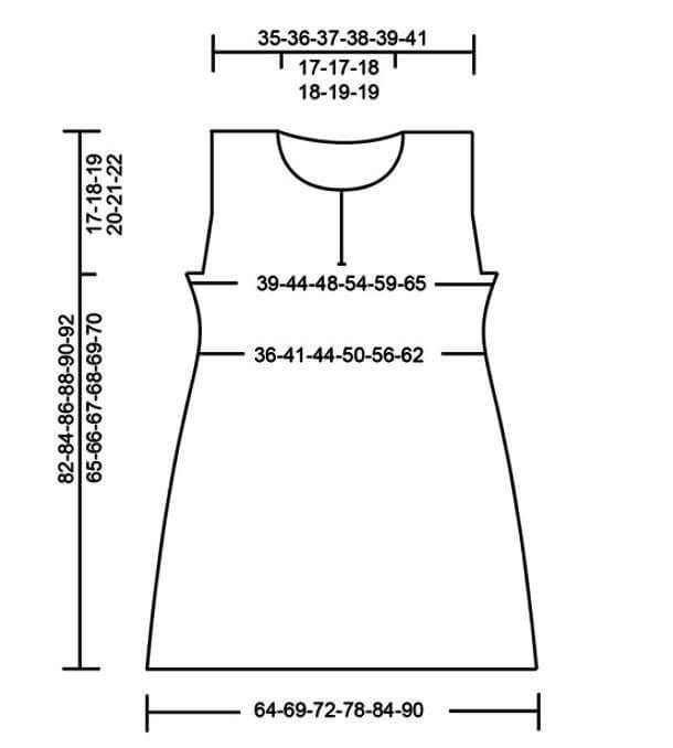 Для создания приталенного силуэта приступим к выполнению равномерных убавок. С обеих сторон от каждого М 12 раз убавляем п. как описано выше. Интервал убавлений – через 4 см. В результате у нас в работе останется 61; 69; 75; 85; 95; 105 п.