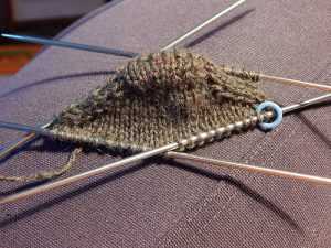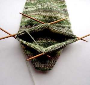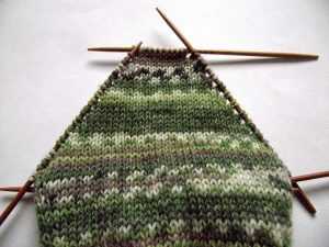 - Вначале вы увеличивали число элементов для последующего формирования клина. Теперь его следует постепенно уменьшить после того, как будет провязано 2, 3 или 4 ряда по кругу после пятки, используя теперь уже петли всех четырех спиц.