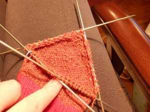 - Начинаем вязать пятку бумеранг с провязывания 31 лиц.п. Выполняем поворот полотна и накидываем нить на спицу. Работаем изнаночными, не довязывая до конца 1 петельку.