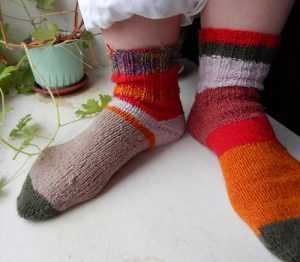 В любом случае носки с такой пяточкой смотрятся просто отлично. Как будто они сделаны не дома, а промышленным способом. И, конечно же, вы можете не ограничиваться всего лишь чулочной вязкой, а использовать для верхней части носочков любой понравившийся вам узор.