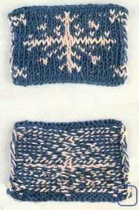 Но существует метод вязания жаккарда без протяжек. Для этого нужно при вывязывании каждой петельки переплетать между собой разноцветные нити, так нить не будет провисать, а будет плотно прилегать к полотну. Вот так выглядит жаккард без протяжек.