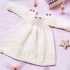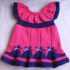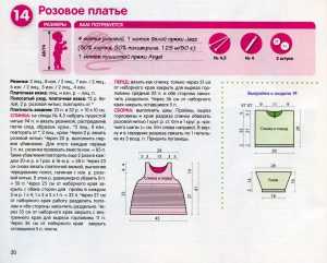 Переднюю полочку платья формируем так же, как спинку, но делаем глубже вырез горловины. Оформлять этот вырез начинаем через 31 см от начального ряда. Закрываем центральные 8 П, после чего выполним отдельно две части полочки. Закруглим вырез точно так же, как это делали на спинке. Довязав перед до 37 см, закрываем последние петли плеч, по 8 штук на каждое плечо. При сборке изделия сшиваем все нужные швы, и обвязываем вырез и проймы крючком. В образованные дырочки протягиваем тонкую атласную ленту, и платье для малышки спицами готово.