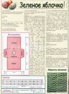 Для вязания спинки наберем 74 петли (П) зеленой пряжей, и вяжем 2 ряда (Р) узором платочная вязка. После этого приступим к выполнению узора по схеме А, делая правильное чередование оттенков, по два Р зелеными и желтыми нитками. Провязав 18 см от начала полотна, выполним ряд с отверстиями. Для этого вяжем такой техникой. После кромочной П вяжем лицевую петлю (ЛП), затем 2 П вместе и накид. Повторяем этот раппорт до конца ряда. На спицах останется 50 петель. Вяжем 24 см после первого ряда, после чего начнем закрывать петли для пройм. Закрываем с каждой стороны по 3 П, потом через ряд 1 раз 2 П, и 2 раза 1 П. После этого на спицах остается 36 петель. Вырез горловины начинаем делать на расстоянии 35 см от начала. Закрываем центральные 10 П. Далее надо закрывать П по краям, то есть через ряд 1х3 П, и 1х2 П. Провязав каждую половинку до длины 37 см, закрываем все оставшиеся 8 П с каждой стороны.
