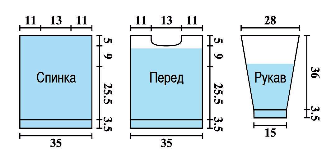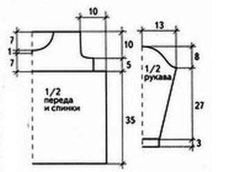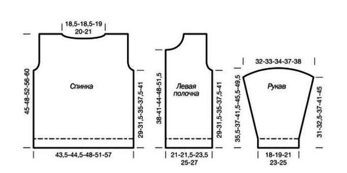Провязав 95; 105; 113; 123 р. (= 31,5; 35; 37,5; 41см) от начала работы, для оформления пройм закрываем с двух сторон однократно по 3 п., потом во всех 2-ых р. трижды по 1 птл. Остается 102; 110; 118; 132 птл.