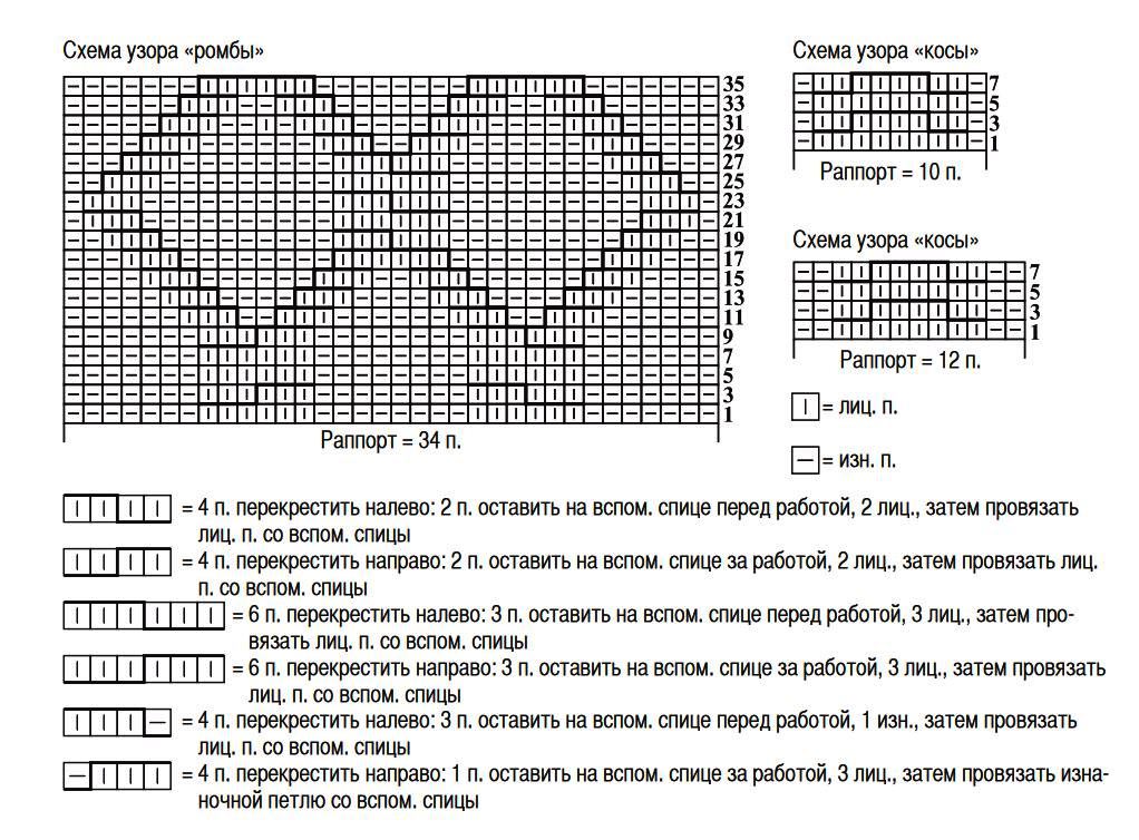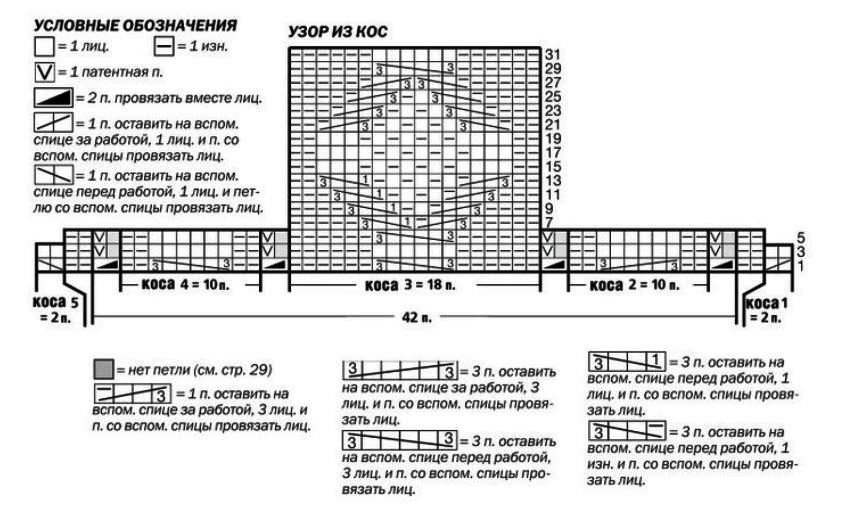 - косы: см. схему. Изн. ряды выполняем по рис-ку, н. вывязываем изн/п. Для выполнения 1 – ой и 5 – ой кос повторяем с 1 р. по 4 р., для 2-ой и 4-ой кос – со 1 р. по 6 р., для 3-ей косы – с 1 р. по 32 р.
