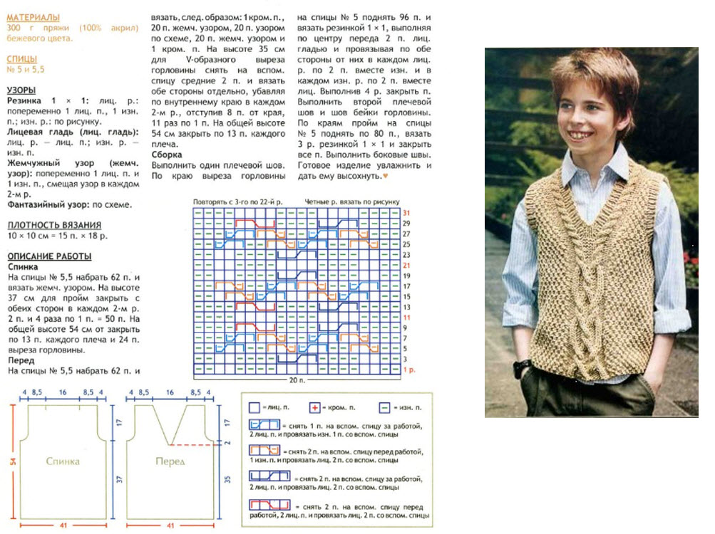 В след-щем р. (из.) 1-ый н. провязываем л/п, 2-ой н. – л. скрещенной. Выполнив 5 р. резиночки, вяжем в лицев./р. все птл по рис-ку, одновременно закрывая. Пришиваем пуговички на левую планочку.