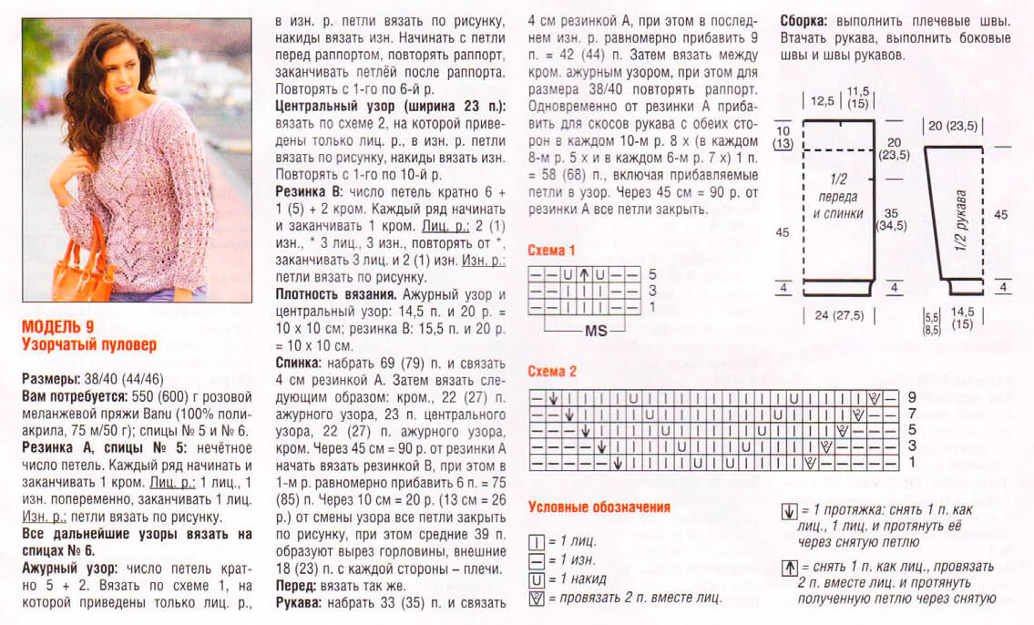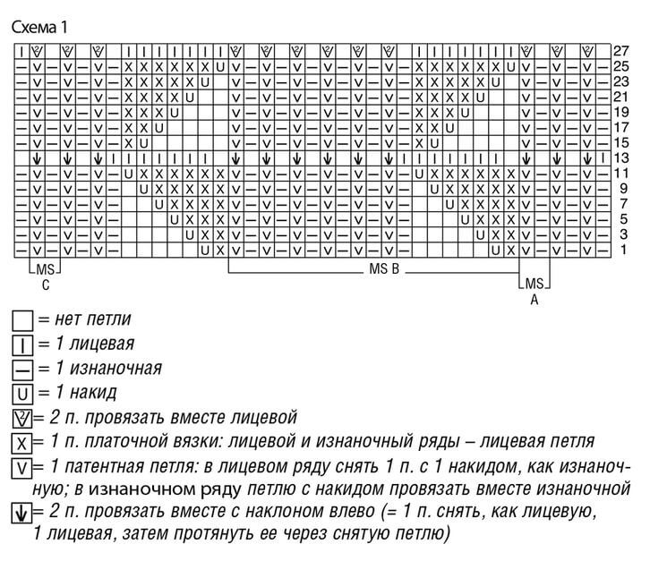 Выполняется по схеме 1 на количестве петель кратном 13 плюс 10 – 1 – 5 плюс 2 кром. п. На схеме показаны только лицевые ряды. Изнаночные ряды провязываем в соответствии с петельками предыдущего р. или в соответствии с описанием, накиды вяжем лицевыми п.