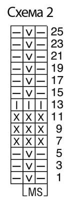 Выполняется на сп. № 6 и №o 7 на нечётном кол-ве петель по сх. 2. На схеме показаны только лиц. р. В изнаночных р. петли вывязываем в соответствии с петельками предыдущего р. или, если сказано иначе, по описанию. Начинаем с 1 кр. п., дальше повторяем раппорт, завершаем петлёй после раппорта и 1 кр. п.