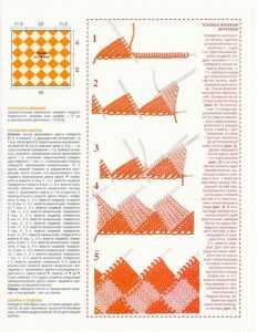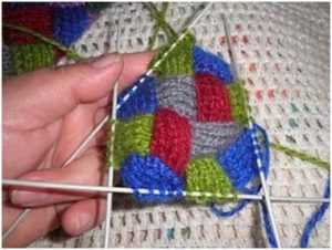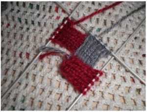 Набираем спицами 5 петель одним из цветов (пусть будет красный) и вяжем лицевой гладью 10 рядов. У вас должно получиться 5 кромочных. Из них следующей спицей необходимо набрать новые петли за заднюю стенку. Другим оттенком вяжем столько же, привязав эту нить к концу предыдущей. Следующее звено делаем также, но красным. А четвертый снова вторым цветом в процессе вязания необходимо соединить с первым. Для этого, начиная с третьего ряда, каждая последняя петля этого квадрата провязывается совместно с кромочной петлей первого сегмента. Таким образом, начинаем с мыска: