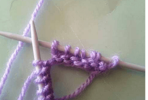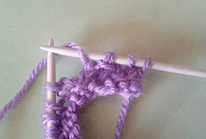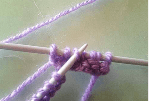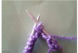Набираем 14 п. и вяжем первый р. лицевыми. Во втором ряду снимаем кромочную и вяжем 3 лиц. п., первую петлю из провязанных захватываем за переднюю дужку левой спицей: