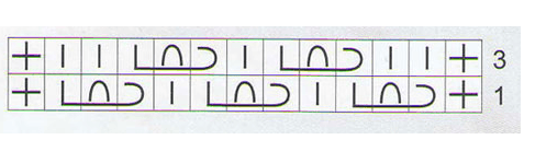Другая рукодельница представляет современный орнамент, как легкий плетеный крест. Наклонные лицевые дорожки сплетаются в крестики и создают невесомую сеточку, благодаря большим разделяющим дырочкам. Схема работы очень простая. Желательно изготовить образец, чтобы разобраться с этим красивым и несложным рисунком: