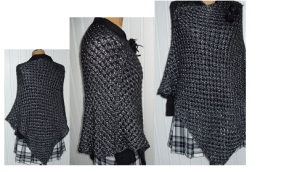Нарядное пончо, связанное из серебристой пряжи, наглядно передает изящество болгарского орнамента. Модель выполнена на крупных спицах № 7-8 пряжей в 2 сложения. Благодаря такому выбору инструментов и ниток, изображение заиграло новыми переливающимися гранями.