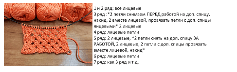 Для ознакомления с секретами узора необходимо связать образец спицами № 3-4. Наберем количество петель, кратное 3, плюс 2 кромочные.