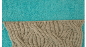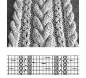 Снимаем первую кромочную П, и провязываем 2 лицевые петли (ЛП). Далее выполняем операцию по перенесению 12 П на дополнительную булавку. Располагаем эти петли впереди полотна, после чего вяжем резинкой очередные 12 П, при этом чередуются 2 ЛП и 2 ИП. Затем резинкой 2х2 вяжутся и П со вспомогательной булавки. Теперь выполняем следующие 24 П, то есть второй раппорт полотна. Продолжая рукоделие, сделаем переплетение в третьем, потом вяжем 4-й по рисунку: