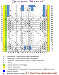 Настоящий мастер-класс дает подробное описание, позволяющее связать накидку Фишю в форме полукольца. Эта модель называется «Нежность». Следуя условным обозначениям, вы можете сформировать данную форму изделия самостоятельно:
