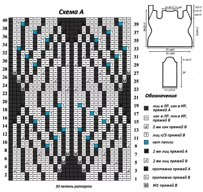 1р. (ЛС): провязать спицами 9 п. рез-ки, продолжить вязание сх. А на 59 п., поместить М; провязать 31 п. – сх. В, установить М, продолжить вязание сх А на 120 п., поставить М, 31 п. – сх. В, поставить М, далее выполняем вязание по рис-ку до конца р. Петельки между М вязать по сх. В для формирования приталивания, сх. А продолжать вязать, как установлено, пока не будут провязаны все рядки сх. В. Всего убавлено 56 п., осталась 261 птл. Между М осталось по 3 п. цвета А.