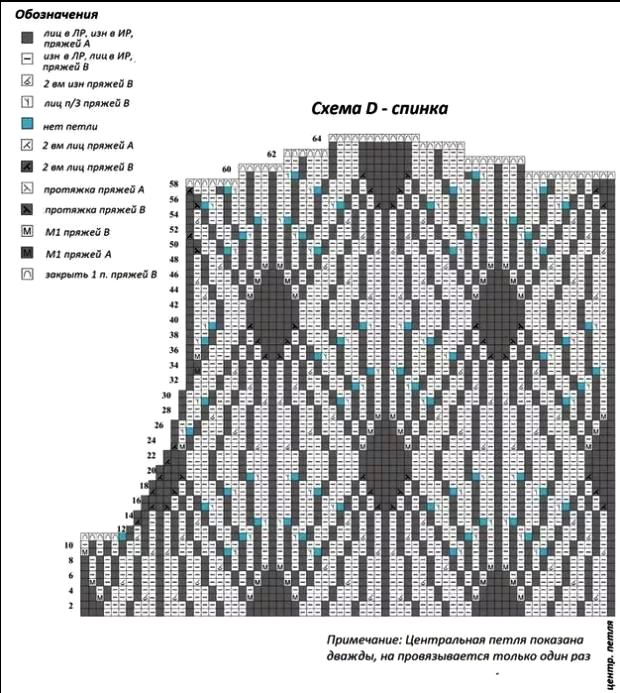 Продолжать вязать сх. А, как установлено, петли между М вязать по сх. С. После окончания прибавлений у вас прибавлено всего 40 п., всего – 301 п. Между маркерами по 23 п. Вязать до 59-го р. схемы С.