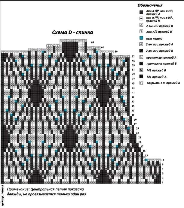След р. (ИС): провязать 8 п. рез-кой, прибавить петлю из протяжки (М1) пряжей А, провязать 60-ый р. схемы С до посл-х 9-ти птл. Эти 9 птл вывязать рез-кой. Всего 302 птл.