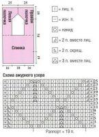Начинаем вязать с правой полочки, для чего выполняем первые двенадцать рядов тем ажурным рисунком, который вы видите на схеме. На этом этапе мы имеем сто четыре полосы от начала вязания. В следующем сто пятом нам нужно начать прибавление. Сначала добавим с левой стороны одну петлю, затем через один тринадцать раз добавим по одной. После этих добавок мы получили тридцать семь петелек. Очередной ряд вязания нужно использовать, чтобы сделать отверстие для пуговицы. С этой целью выполняем следующие действия: