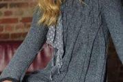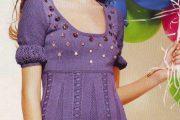 Итак, платье начинает вывязываться спицами с передней части. Для этого вам следует на спицы набрать сто восемнадцать петелек (сто шестнадцать плюс две кромочных) и вязать полотно, согласно следующей схемы: кромочная, сорок шесть п. основного узора, двадцать четыре п. узора схемы, сорок шесть п. основного узора и кромочная. Достигнув высоты в 24, 27 и 30 сантиметров, вам необходимо произвести убавление, чтобы приталить изделие по обеим сторонам по 1 петельке. На высоте тридцати восьми сантиметров петлицы основного узора вяжутся на основе резинки два на два, петлицы косы продолжаются провязываться согласно рисунка. После десяти сантиметров, петельки резинки вновь вяжутся основным узором. По достижению высоты в шестьдесят шесть сантиметров, вязание разделяется по центру, после чего стороны вяжутся по-отдельности. Здесь также следует делать убавления для формирования закругления по внутренней стороне вдоль косы по одному звену, путем провязывания двух совместных петлиц изн. во всех четвертых рядах восемь раз, а потом во всех восьмых – три раза. Дальше вязание идет прямо. Наряду с этим, на высоте горловины в два сантиметра, вам необходимо будет для формирования проймы с боку закрыть один раз по четыре звена, раз – по два еще два раза по одному. Затем на высоте горловины в двадцать см – чтобы сделать плечевой скос с боку нужно закрыть три раза по семь петель и один раз по пять. После этого, петельки косы вяжутся прямо на протяжении одиннадцати см и закрываются. Вторая сторона горловины делается по симметрии.