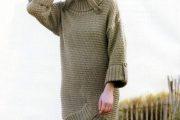 Работы над предложенным фасоном платья-туники состоит в вязании спицами основного узора, складывающегося из поочередного провязывания лицевой и изнаночной петель, путем смещения узора на 1 звено во всех рядах.